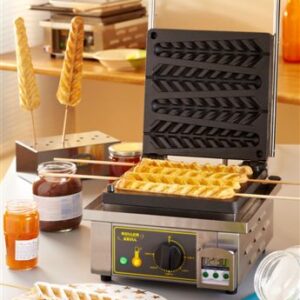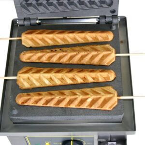 Ge dina kunder en smakupplevelse utöver det vanliga! Baka pinnvåfflorna och doppa dem sedan i t.ex. choklad och ganera med nötter, strössel eller crisp. Servera direkt eller i en liten ask med grädde, jordgubbar eller andra goda bär och frukter. Våffelmaskinen passar utmärkt till kiosker, uteserveringar, evenemang mm. Den har hög kapacitet på litet utrymme. De starkt ledande gjutjärns bakplattorna sprider värmen jämnt och ger gyllene, krispiga våfflor. Det tar endast 2,5 min att baka 4 st våfflor.