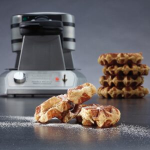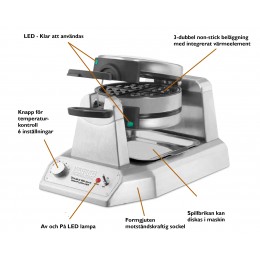 Marknadens bästa våffeljärn för belgiska våfflor. Den roterande funktionen,  temperaturkontrollen och indikatorn ser till att våfflor bakas och bryn jämnt, uppifrån och ned. Trippelbelagd, nonstick plattor släpper våfflor i perfekt form och gör rengöring snabbt och enkelt.